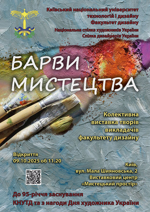 КОЛЕКТИВНА ВИСТАВКА ВИКЛАДАЧІВ ФАКУЛЬТЕТУ ДИЗАЙНУ КНУТД «БАРВИ МИСТЕЦТВА» 9.10–30.10.2025 р. Відкриття 9 жовтня 2025 року о 11:20 у виставковому центрі КНУТД «Мистецький простір» Виставковий центр «Мистецький простір КНУТД» презентує колективну виставку викладачів факультету дизайну КНУТД «БАРВИ МИСТЕЦТВА», приурочену до Дня художника України та до 95-річчя заснування КНУТД. Виставка «БАРВИ МИСТЕЦТВА» вражає розмаїттям стилів, жанрів та яскравих кольорів і презентує понад 20 тематичних картин, створених художниками, що викладають у КНУТД. Серед учасників виставки як відомі художники, члени Національної спілки художників України, Спілки дизайнерів України, так і молоді таланти, які тільки розпочинають свій творчий шлях. Факультет дизайну КНУТД більше 25 років навчає і готує фахівців в різних галузях дизайну. Дизайнери – це митці, які творять в плоскості не тільки практики, а й естетики, тому художня складова підготовки дизайнерів є надзвичайно важливою. Саме тому викладачі факультету дизайну КНУТД мають художню підготовку і працюють і різних техніках: живопис, графіка, акварельна, пастельна техніка, комп’ютерна графіка, книжкова ілюстрація тощо. |