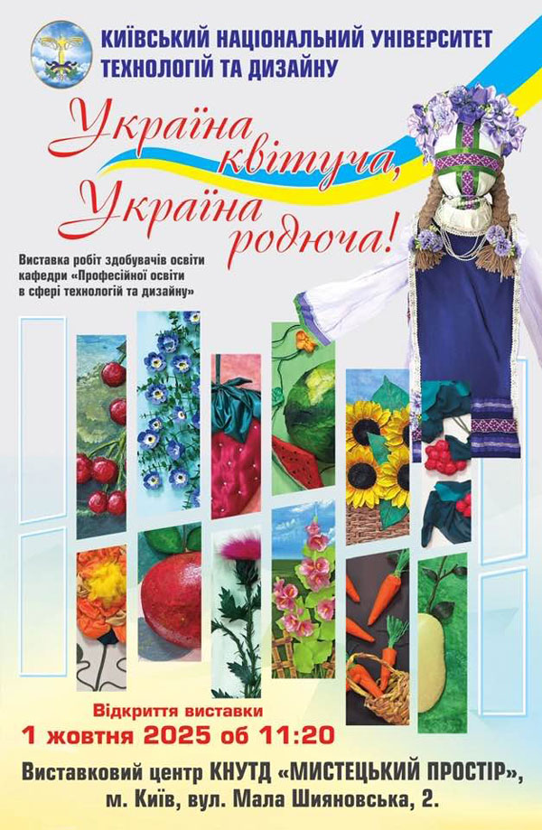 ВИСТАВКА КАФЕДРИ ПОСТД «УКРАЇНА КВІТУЧА, УКРАЇНА РОДЮЧА!» 01.10–05.10.2025 р. Відкриття – 1 жовтня 2025 року у виставковому центрі КНУТД «Мистецький простір» Виставка «Україна родюча, Україна квітуча!», підготовлена здобувачами освіти кафедри професійної освіти в сфері технологій та дизайну. Експозиція об’єднала серію декоративних панно, створених студентами з тканини, шкіри та пап’є-маше, де кожна робота стала символом любові до рідної землі, її краси, сили та щедрості. У центрі виставки — образи, що уособлюють душу України: маки й соняшники, калина, вишні, мальви, гарбуз, яблуко, в’юнок, будяк. У кожному творі — власний настрій, кольори і відчуття — від лагідного світла літа до глибокої вдячності землі, яка дає життя і натхнення. Ця колекція робіт стала своєрідною візуальною поемою про Україну — родючу, працьовиту, стійку, але водночас ніжну й поетичну. |