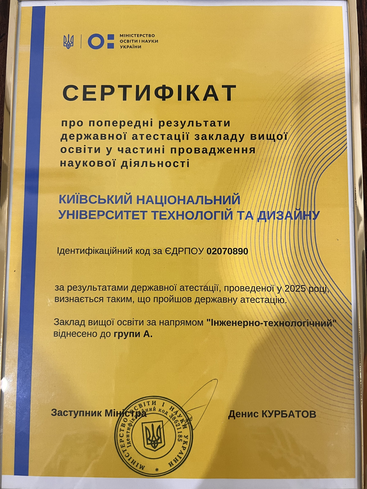 Цьогоріч Київський національний університет технологій та дизайну, пройшов державну атестацію в частині провадження наукової діяльності уже за двома науковими напрямами, за напрямом «Інженерно-технологічний» віднесений до групи А, за напрямом «Суспільний» віднесений до групи Б. Це підтверджують сертифікати, видані Міністерством освіти і науки України.