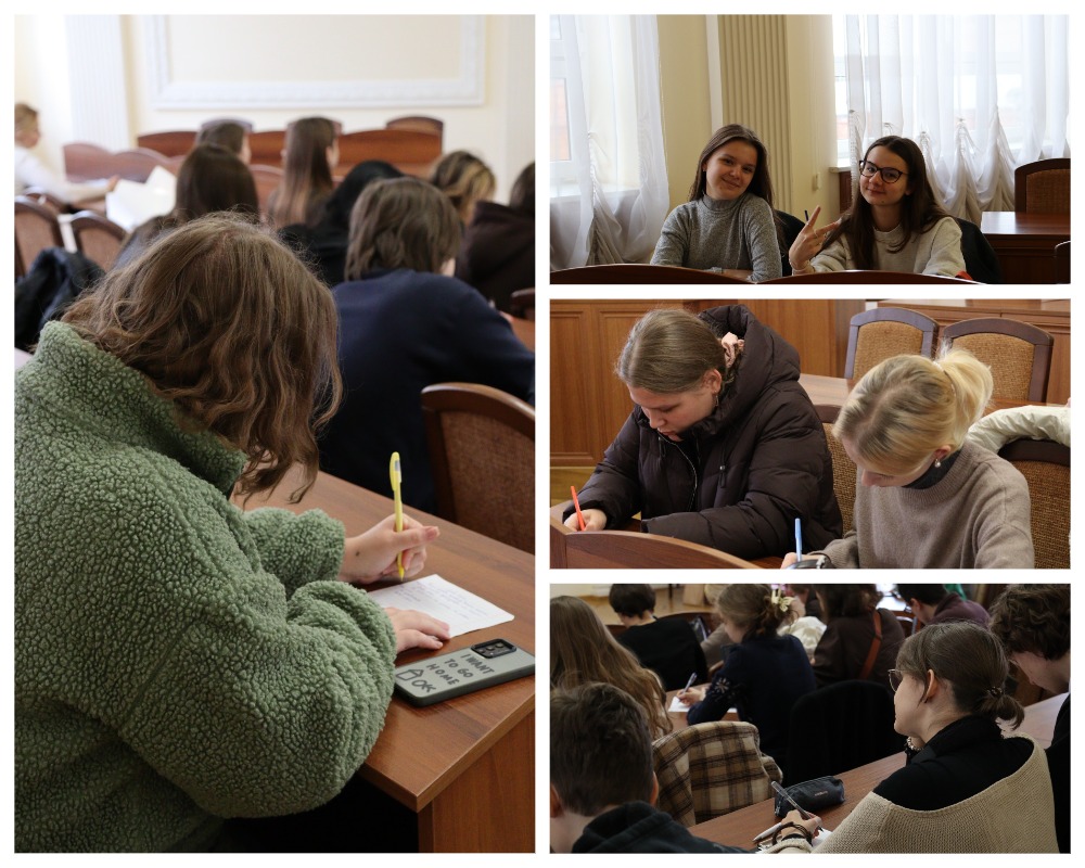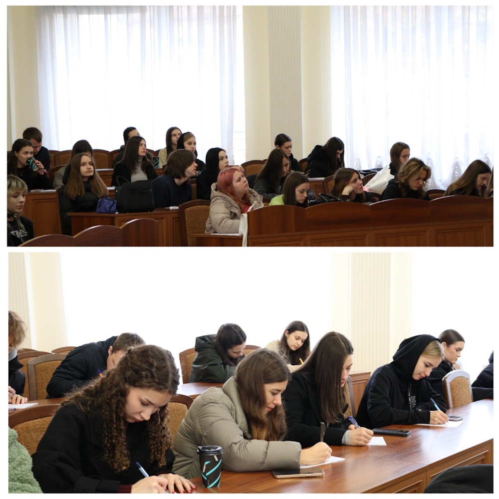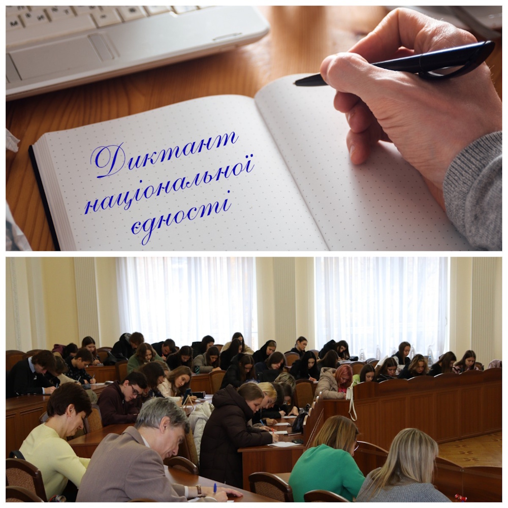Учасники зібрались у залі засідань Вченої ради та уважно слухали текст диктанту «Треба жити!», який написала Євгенія Кузнєцова, українська письменниця, перекладачка та науковиця, а зачитала Наталія Сумська, народна артистка України, провідна акторка та телеведуча.