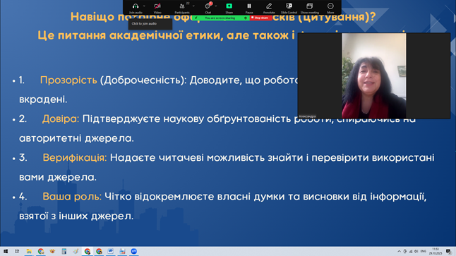 Пані Олександра ЧЕПІЛКО детально зупинилася на питаннях коректного цитування джерел, оформлення бібліографічних посилань та особливостях використання штучного інтелекту у наукових дослідженнях.