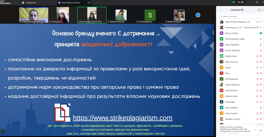 На зустрічі було зроблено акцент на норми «Положення про запобігання та виявлення академічного плагіату в наукових роботах в Київському національному університеті технологій та дизайну» та порядок перевірки наукових робіт на ознаки академічного плагіату за допомогою програмного продукту StrikePlagiarism.