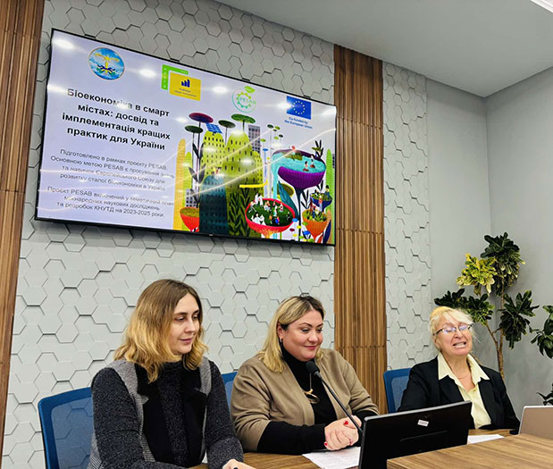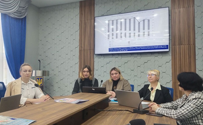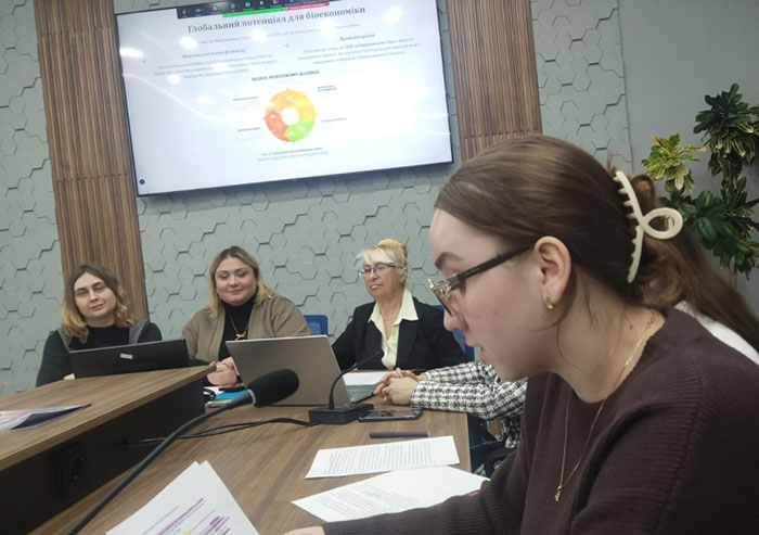 Координатор проєкту Поліна ПУЗИРЬОВА, доктор економічних наук, професор, завідувач кафедри економіки, представила доповідь на тему «Перспективи формування екосистеми економіки України на засадах біоекономіки», де зазначила про стратегічний шлях до сталого розвитку через інновації, відновлювані ресурси та технологічну модернізацію. Вона наголосила на тому, що біоекономіка для України – це стратегічна економічна модель, яка здатна забезпечити стійке післявоєнне відновлення, декарбонізацію й технологічне оновлення.