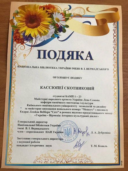 5 листопада 2025 року у Національній бібліотеці України імені В. І. Вернадського відбувся масштабний культурно-науковий захід, присвячений 1000-літтю вшанування пам’яті Візантійського імператора Василія II Порфірогенета. Програма організована у співпраці з Національним заповідником «Софія Київська», Музеєм Параджанова Київського міжнародного університету, а також Київським національним університетом технологій та дизайну, що стане важливою платформою для дослідження тисячолітніх українсько-вірменських історичних і культурних зв’язків. До вітального слова, зокрема відкритті виставки долучилися з концертним номером науково-педагогічні працівники та здобувачі освіти спеціальності В6 «Перформативні мистецтва» кафедри сценічного мистецтва і культури Факультету культури і культурних індустрій.