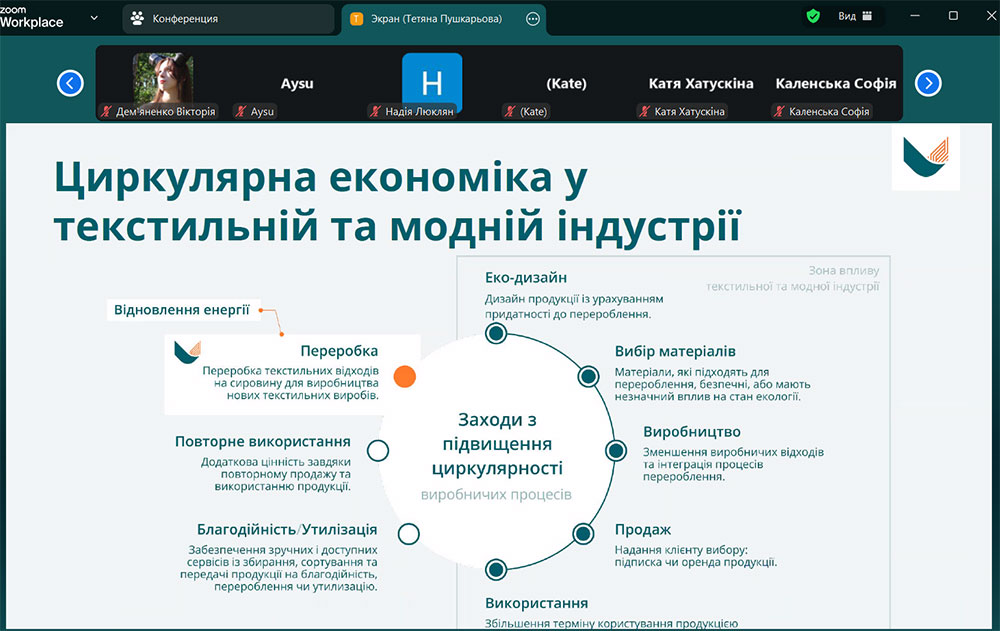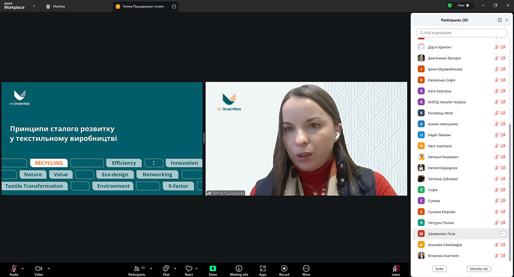 Тетяна Пушкарьова поділилась власним досвідом роботи у модній індустрії та можливостями поєднання майстерності з сучасними принципами сталого розвитку, представляючи моду крізь призму відповідального дизайну та циркулярної економіки. Спікер ознайомила з вимогами до екодизайну, напрямками переробки текстилю, основними законодавчими актами, що спрямовані на запобігання утворенню текстильних відходів, розширення відповідальності виробника за вироби упродовж життєвого циклу та підкреслила важливість етапу дизайну текстильних виробів для подальшої можливості їх переробки.