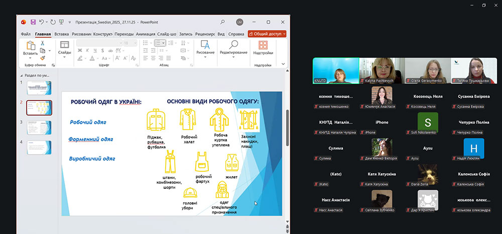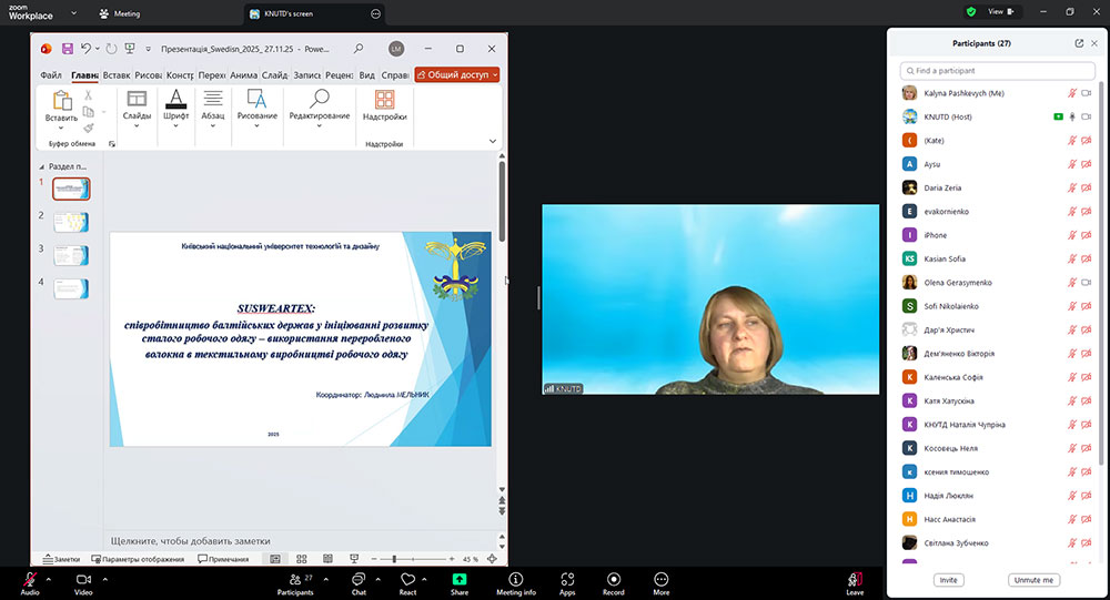 Модератором заходу виступила Людмила Мельник, кандидат технічних наук, доцент, доцент кафедри мистецтва та дизайну костюма, координатор проєкту SusWearTex. Активну участь у семінарі взяли студенти ОП «Дизайн одягу», ОП «Дизайн костюма», аспіранти ОНП «Дизайн» факультету дизайну, викладачі кафедри мистецтва та дизайну костюма, а також виконавці наукового проєкту SusWearTex. На початку заходу Людмила Михайлівна Мельник презентувала основні етапи та цілі проєкту «SusWearTex: співробітництво Балтійських держав у ініціюванні розвитку сталого робочого одягу – використання переробленого волокна в текстильному виробництві робочого одягу».