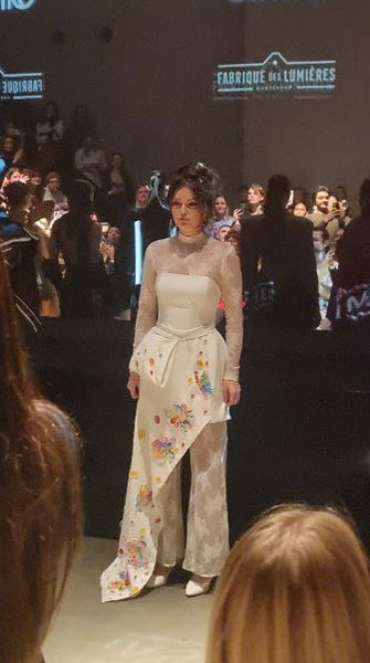 Здобувачі освіти Євгенія Лазарів та Анастасія Стельмах гідно представили КНУТД та продемонстрували виготовлену в матеріалі модель одягу, велику 3D-модель на сцені висотою 8 м, а також низку промо-відео та відео процесу створення. Моделі створені із використанням 3D-друку, лазерної різки, цифрового текстилю, VR/AR-технологій та генеративного 3D-моделювання, а сотні проєкцій на стінах Fabrique des Lumières і голографічне шоу перетворили подіум на інтерактивний тривимірний простір, де цифрові та фізичні елементи гармонійно поєднувалися.