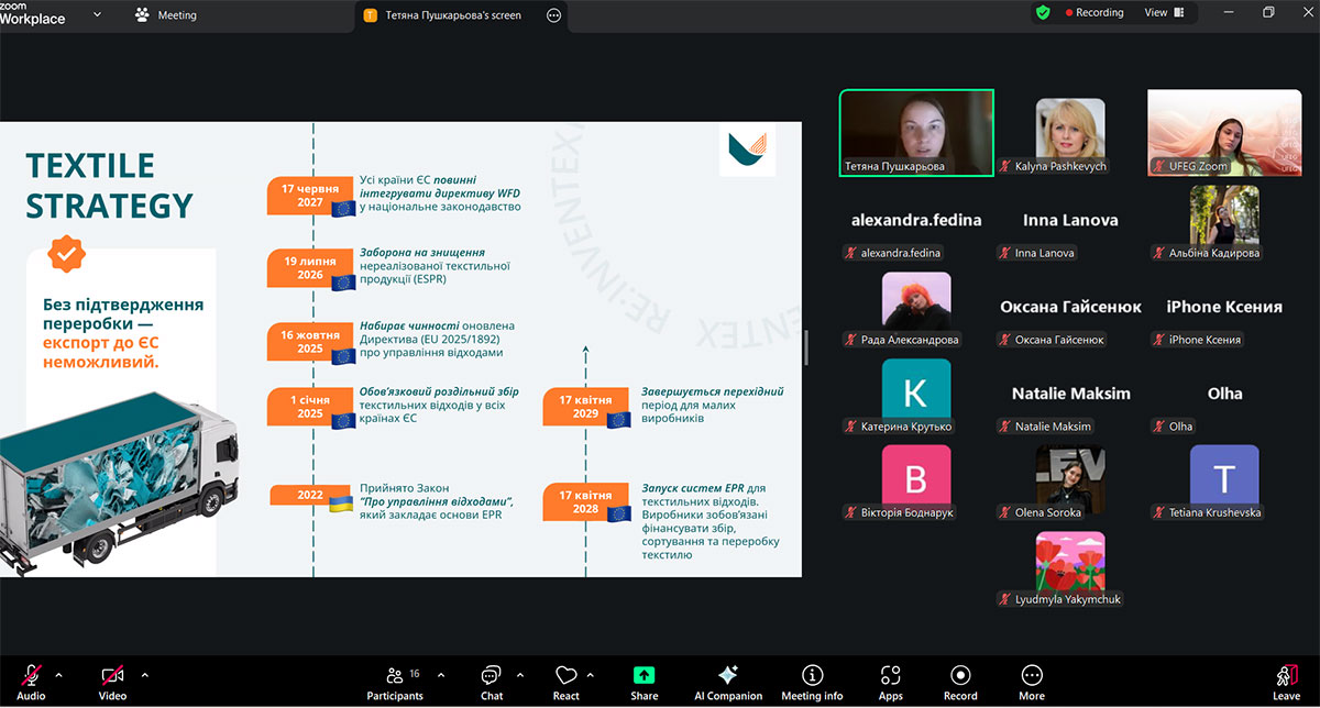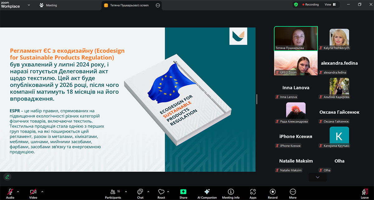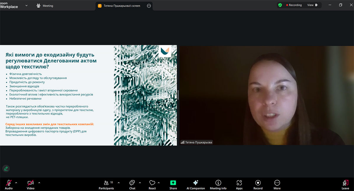 Тетяна Пушкарьова розповіла про нові вимоги ЄС до екодизайну, впровадження цифрового паспорту продукту, напрями переробки текстилю в світі, основні законодавчі акти, що спрямовані на запобігання утворенню текстильних відходів, поточний стан текстильного законодавства України, ключові прогалини та перспективи гармонізації з ЄС тощо.