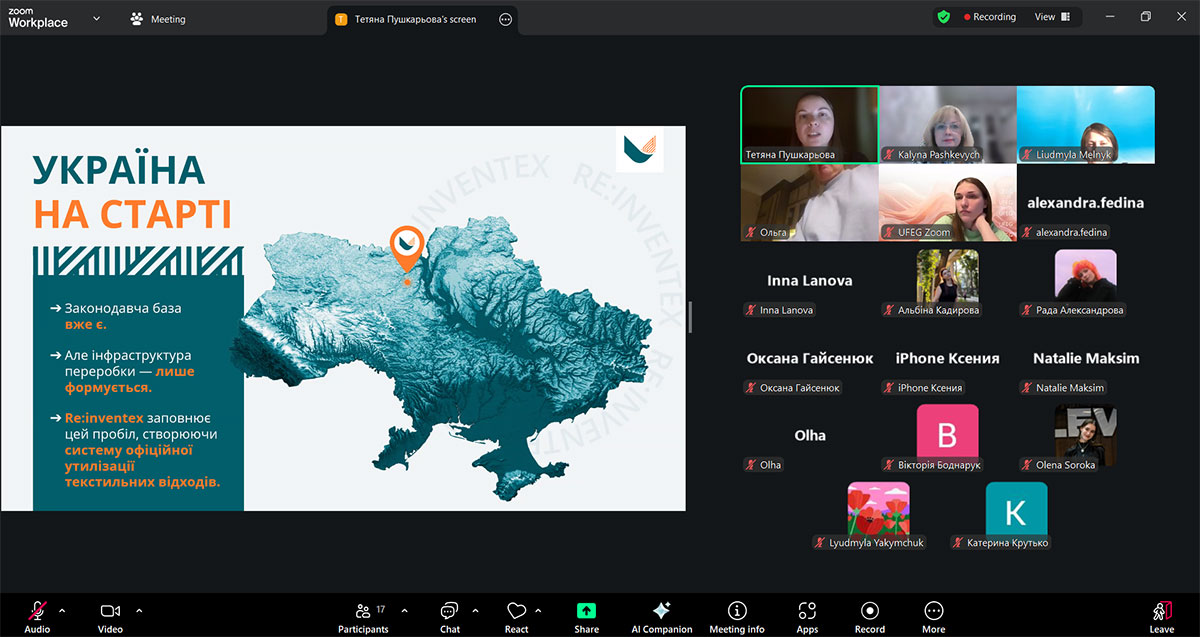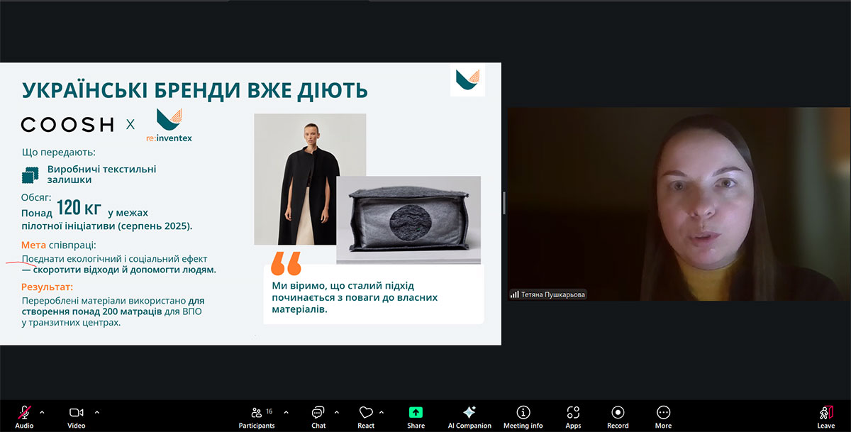 Цікавою була інформація про імплементацію відповідальної утилізації відходів текстильного виробництва в Україні. Спікерка розповіла про досвід українських підприємств, які активно долучаються до переробки відходів. Підприємство Re:inventex є лідером сталого розвитку у текстильному виробництві та безвідходному використанні текстильних ресурсів в Україні і світі та активно співпрацює з швейними та текстильними підприємствами.