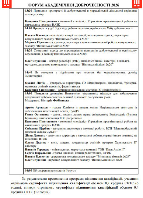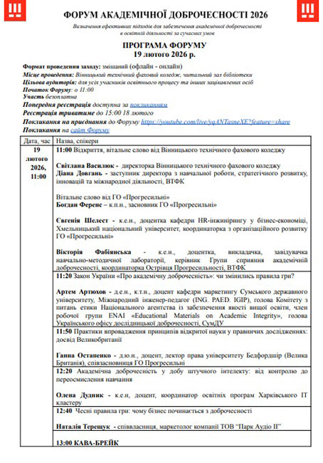 Форум було організовано за ініціативи Вінницького технічного фахового коледжу спільно з ГО «Прогресильні», який став майданчиком для професійного діалогу щодо практичного впровадження нового законодавства, підписаного Президентом України 29 січня 2026 року. Учасники заходу обговорили ключові положення Закону України «Про академічну доброчесність», механізми його реалізації в закладах освіти різних рівнів, а також питання відповідального використання штучного інтелекту в навчальному процесі. Під час панельних дискусій і тематичних виступів експерти розглянули міжнародний досвід забезпечення академічної доброчесності, зокрема практики Великої Британії, проаналізували етичні та правові аспекти використання цифрових технологій, запобігання плагіату й маніпуляціям в академічних текстах. Окрему увагу було приділено ролі доброчесності у формуванні професійної етики майбутніх фахівців і зміцненні довіри в бізнес-середовищі. Участь у форумі сприяла поглибленню професійних компетентностей, обміну досвідом із колегами з інших закладів освіти та формуванню спільного бачення розвитку культури академічної доброчесності в Україні. За результатами роботи учасники отримали сертифікати підвищення кваліфікації, що підтверджують їхню обізнаність у питаннях етики в освіті, критичного мислення, інформаційної грамотності та відповідального використання інноваційних технологій. Проведення таких заходів засвідчує зростання уваги освітньої спільноти до формування системної політики академічної доброчесності та впровадження сучасних стандартів якості освіти.