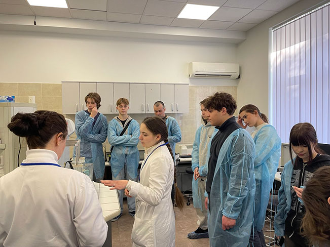Розпочався захід із відвідування кафедри промислової фармації КНУТД. Старшокласників привітала доктор технічних наук, доцент, професор кафедри Олена ІЩЕНКО, яка детально ознайомила учнів із перевагами навчання в КНУТД, освітнім середовищем університету, перспективами професійної реалізації випускників, умовами вступу та особливостями навчання за освітньо-професійними програмами «Інноваційна фармацевтика» та «Промислова фармація». До професійного діалогу з учнями долучилася Анастасія БЕГДАЙ – випускниця кафедри промислової фармації, яка сьогодні успішно продовжує свій шлях у науці на посаді наукового співробітника кафедри. Її особистий досвід та історія професійного розвитку стали надзвичайно цінними для старшокласників, адже вони мали змогу почути з перших вуст, як знання та практичні навички, здобуті в університеті, застосовуються у реальній роботі.