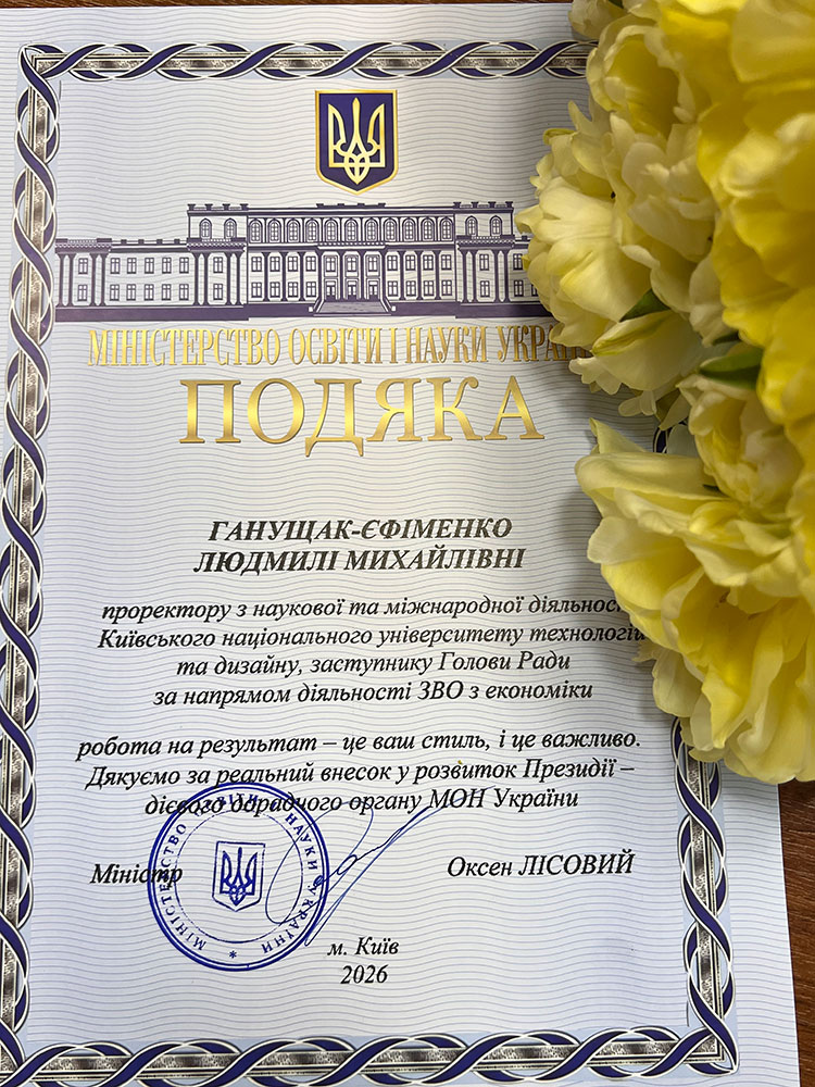 Адміністрація Київського національного університету технологій та дизайну висловлює подяку представникам МОН України, профільному заступнику міністра Денису Курбатову, ректорам Київського національного університету імені Тараса Шевченка Володимиру Бугрову та Київського національного університету будівництва і архітектури Олексію Дніпрову, Раді проректорів з наукової роботи закладів вищої освіти України, в особі Голови Ради Володимира Павлікова, експертам, представникам Наукового Комітету Національної ради з питань розвитку науки і технологій, Раді молодих вчених при МОН України за професійність, готовність працювати системно задля розвитку науки і післявоєнної відбудови.