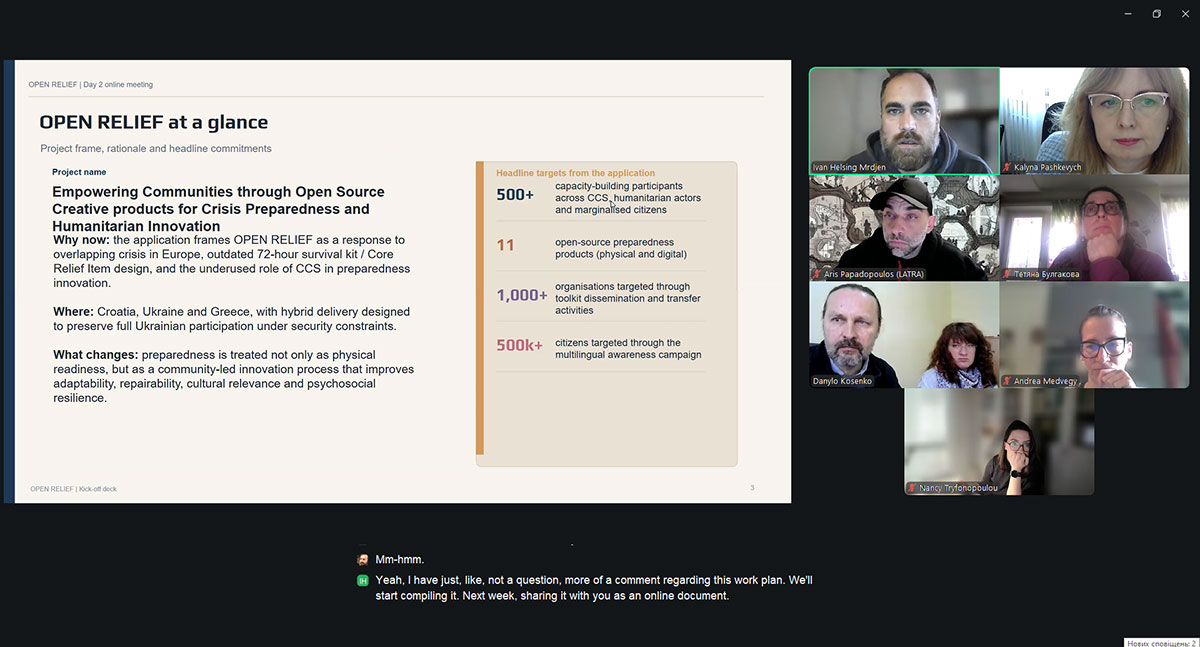 Проєкт Empowering Communities through Open Source Creative Solutions for Crisis Preparedness and Humanitarian Innovation (OPEN RELIEF) фінансується програмою «Креативна Європа» та покликаний надати фахівцям культурного й креативного сектору змогу спільно розробляти стійкі, ремонтопридатні й масштабовані гуманітарні рішення – такі як комплекти виживання та укриття – у співпраці з неурядовими організаціями та громадами України, Хорватії та Греції з метою підвищення готовності до кризових ситуацій і зміцнення стійкості.