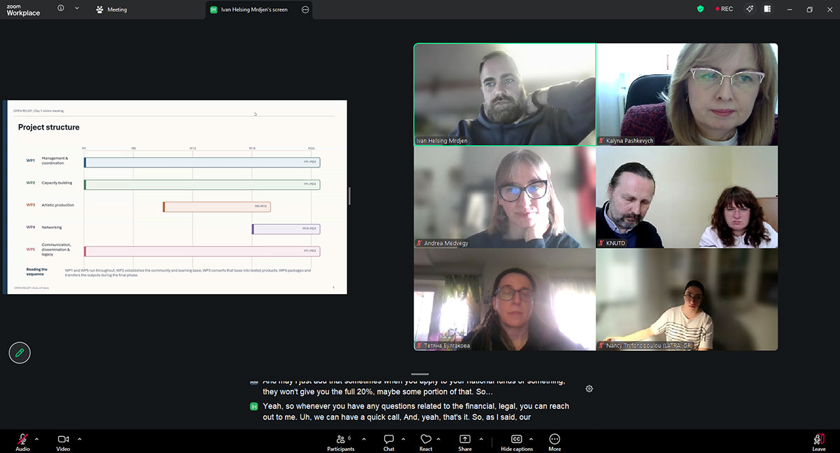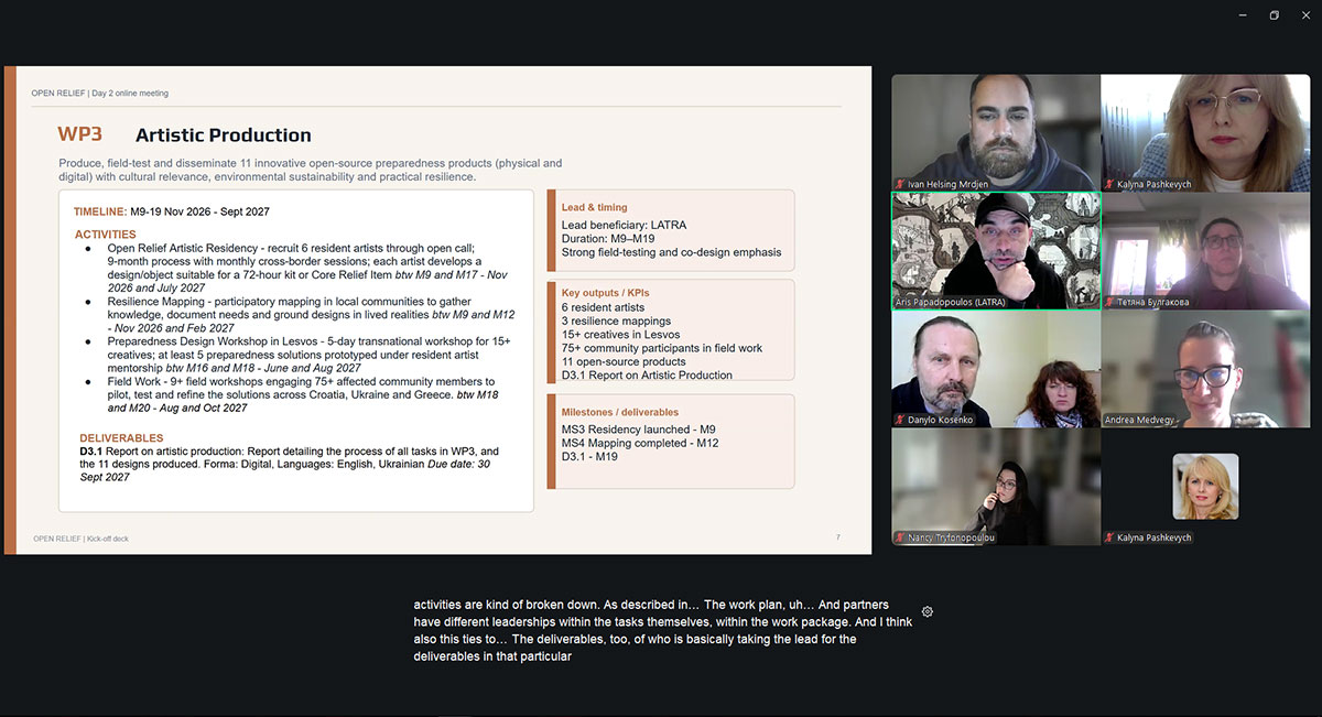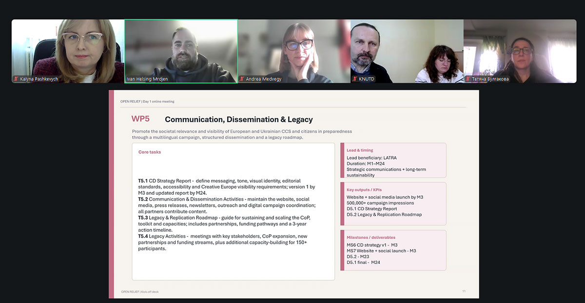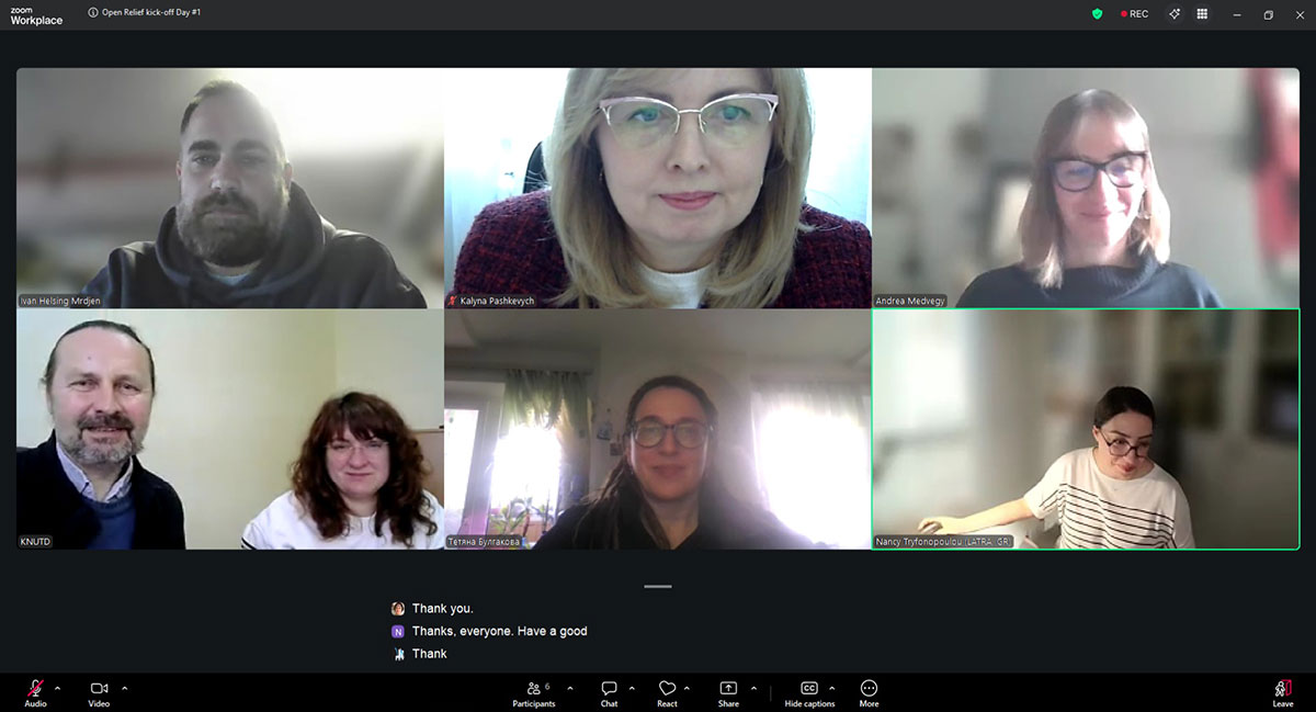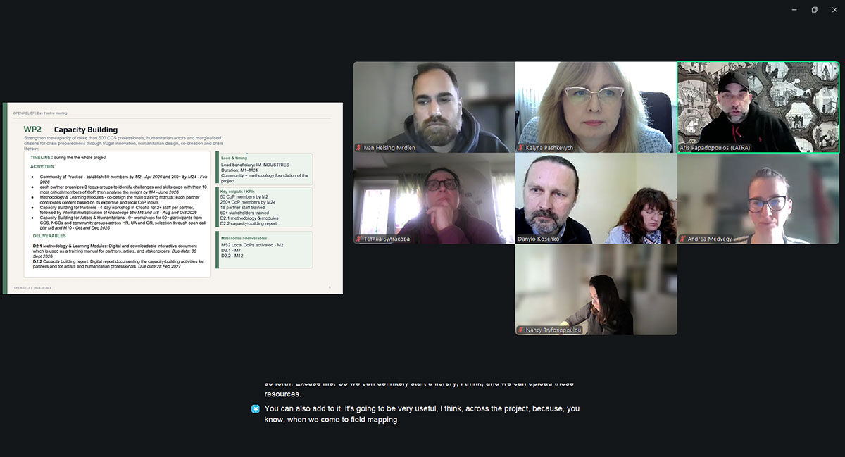 24 та 27 березня 2026 року в онлайн режимі відбулася установча зустріч учасників міжнародного консорціуму грантового проєкту OPEN RELIEF, що фінансується в межах програми Європейського Союзу «Креативна Європа» CREA-CULT-2025-COOP. Учасниками консорціуму є IM Industries (Хорватія), LATRA (Греція) та Київський національний університет технологій та дизайну. Від КНУТД у зустрічі взяли участь керівник проєкту Данило Косенко, завідувач кафедри дизайну інтер’єру і меблів (ДІМ), та члени робочої групи: Калина Пашкевич, декан факультету дизайну, доценти кафедри ДІМ Тетяна Булгакова та Олександра Шмельова-Нестеренко.