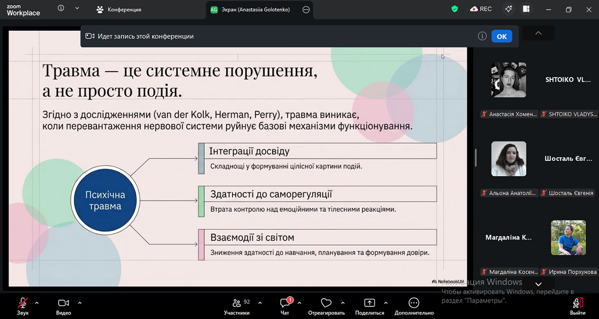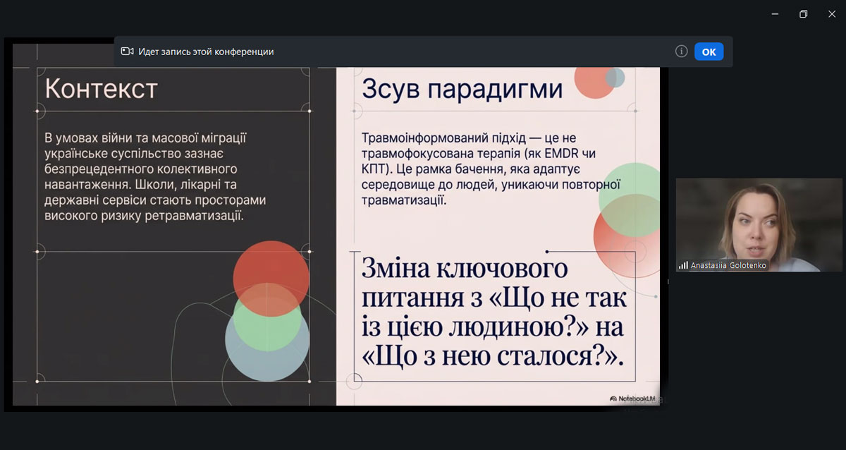Спікеркою заходу виступила Анастасія Голотенко – PhD, психологиня, експертка Координаційного центру з психічного здоров’я КМУ. У межах вебінару вона представила системне бачення травмоінформованого підходу як сучасної методологічної основи взаємодії в освітньому, соціальному та професійному середовищах.