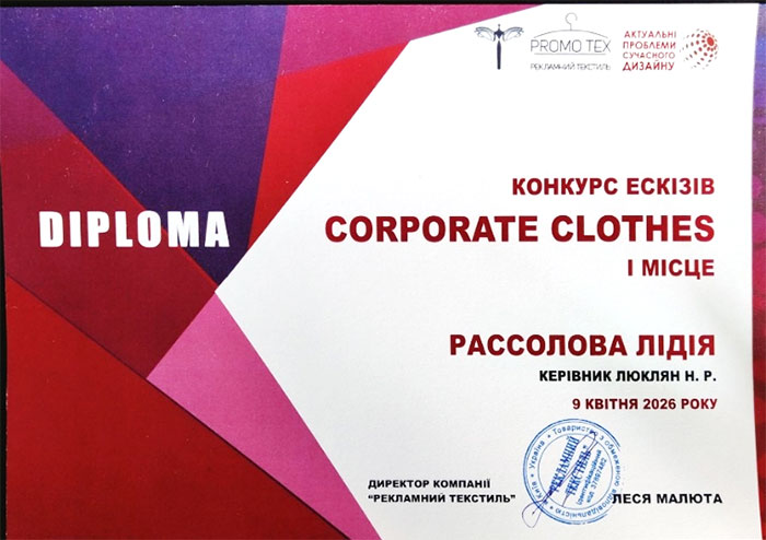 09 квітня 2026 року авторитетне журі на чолі з Лесею Малютою, директором компанії «PROMO TEX», підбило підсумки конкурсу. Подія відбулась в рамках пленарного засідання VІІІ Міжнародної науково-практичної конференції «Актуальні проблеми сучасного дизайну».