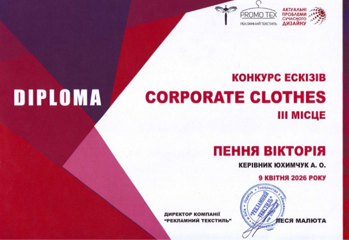 В рамках VІІІ Міжнародної науково-практичної конференції «Актуальні проблеми сучасного дизайну», що відбулася 9 квітня 2026 року в КНУТД, компанією «PROMO TEX», лідером ринку корпоративного текстилю та багаторічним партнером факультету дизайну КНУТД, було проведено конкурс ескізів одягу «CORPORATE CLOTHES».