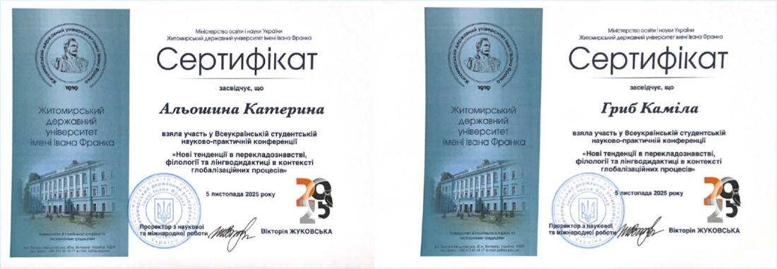 За результатами участі у Всеукраїнській студентській науково-практичній конференції «Нові тенденції в перекладознавстві, філології та лінгводидактиці в контексті глобалізаційних процесів» студентки групи БАМ-23 Гриб Каміла та Альошина Катерина отримали сертифікати учасників.