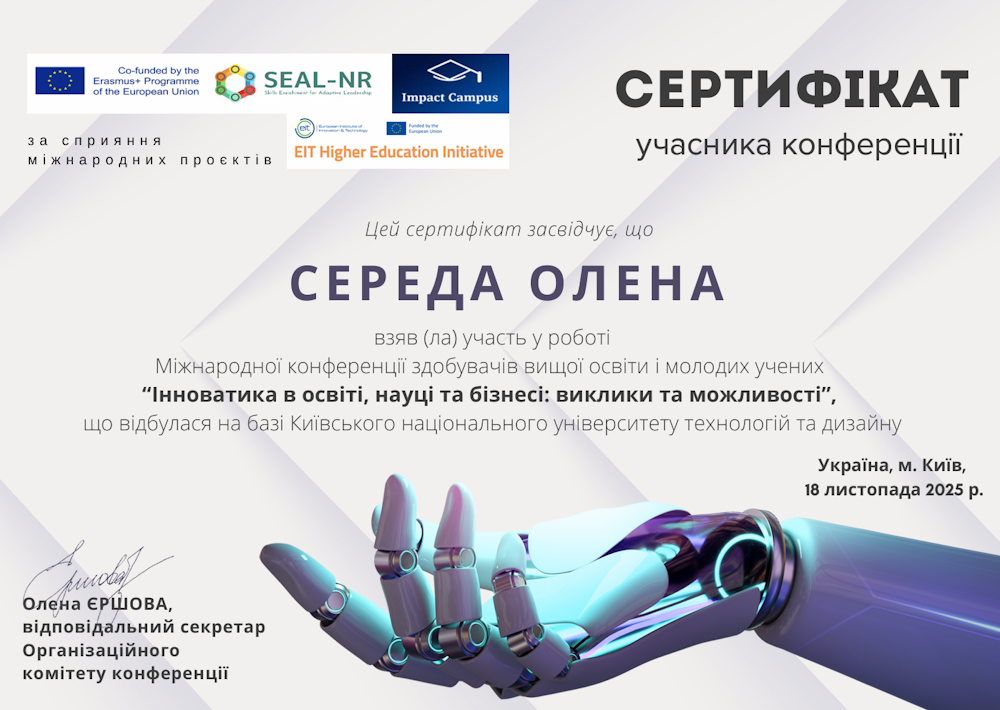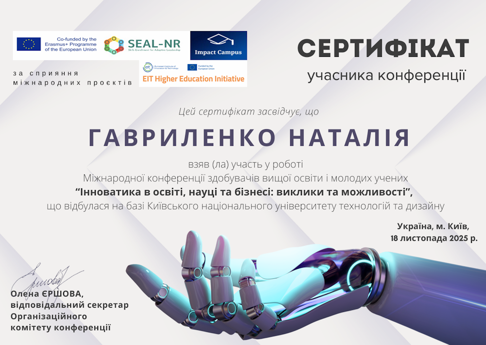 Учасники гуртка прийняли активну участь в роботі Міжнародної конференції «Інноватика в освіті, науці та бізнесі: виклики та можливості», яка відбулася 18 листопада 2025 року в Київському національному університеті технологій та дизайну (м. Київ, Україна).