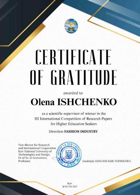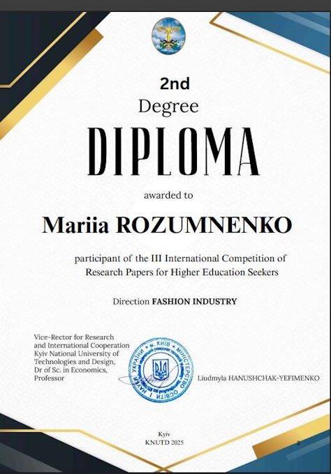 За цей період студентка Марія РОЗУМНЕНКО прийняли участь у ІІІ Міжнародному конкурсі наукових робіт здобувачів вищої освіти Fashion industry з роботою на тему «Textiles to Save Lives» та посіла 2-ге місце.