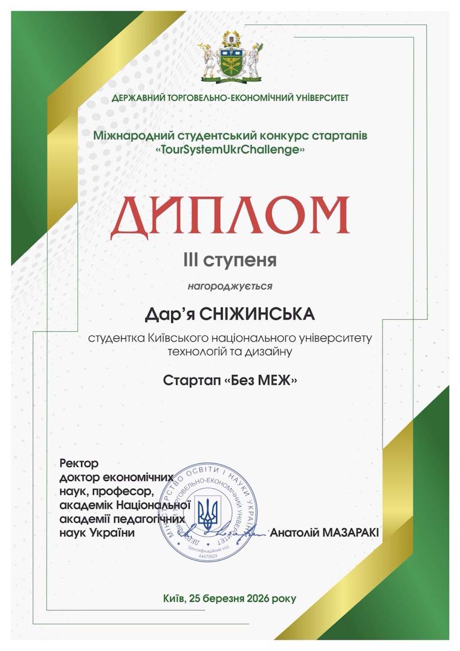 Гідно представила Київський національний університет технологій та дизайну студентка кафедри туризму та готельно-ресторанного бізнесу Сніжинська Дар’я, яка презентувала стартап-проєкт «БезМеж» (секція Startup.Hospitality_2026), розроблений під науковим керівництвом д. н. держ. упр., професора кафедри туризму Ахмедової Олени.