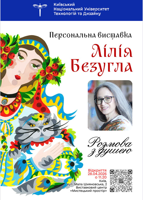 ПЕРСОНАЛЬНА ВИСТАВКА ЛІЛІЇ БЕЗУГЛОЇ «РОЗМОВА З ДУШЕЮ» 28.04 – 29.05. 2026 Відкриття 28 квітня 2026 року о 11:20 у виставковому центрі КНУТД «Мистецький простір» Виставковий центр «Мистецький простір КНУТД» презентує персональну виставку «Розмова з душею» Лілії Безуглої, старшого викладача кафедри дизайну інтер’єру і меблів КНУТД. На виставці представлені художні роботи майстрині, виконані протягом останніх років для оздоблення екстер’єрів, інтер’єрів, побутових предметів, декорованих орнаментами та символами, що підкреслює естетику та функціональність та популяризує декоративно-ужиткове мистецтво. |