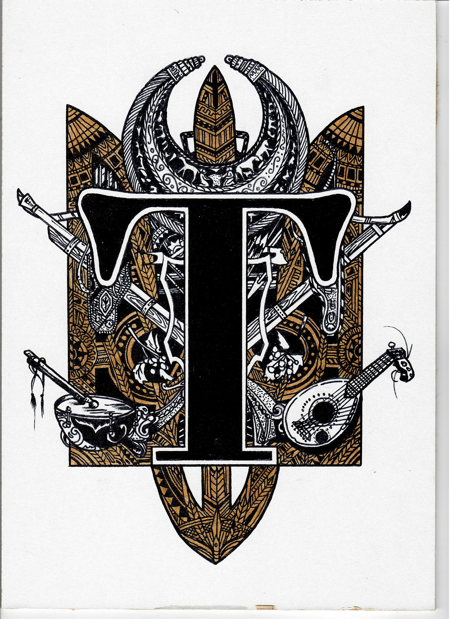 Т Буквиця. 20*30 см. Картон. Акрил. Маркери. Тризуб є Головним маркером української ідентичності. Тризуб із найдавніших часів вважався магічним знаком сокола Рарога, давньослов’янського божества небесної блискавки, та світовим символом триєдинства.
