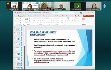 Обговорення та розповсюдження місії, ідей проєкту, важливості використання перероблених волокон у текстильних матеріалах виконано в межах онлайн зустрічей з галузевими партнерами, науковцями, аспірантами, студентами.