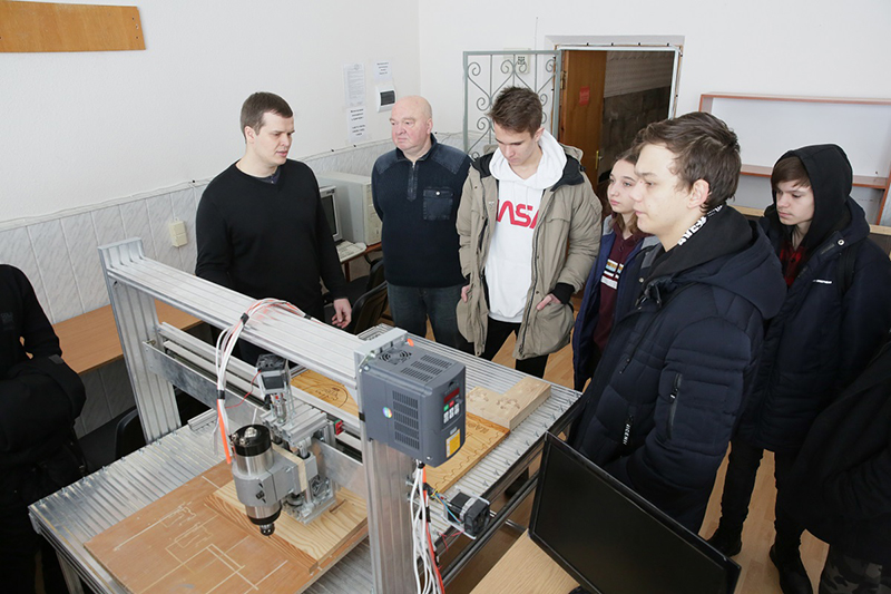 Доцент Барилко С.В. відповідає на питання учнів ДТЛ з особливості роботи та програмування автоматизованого станка з числовим програмним керуванням
