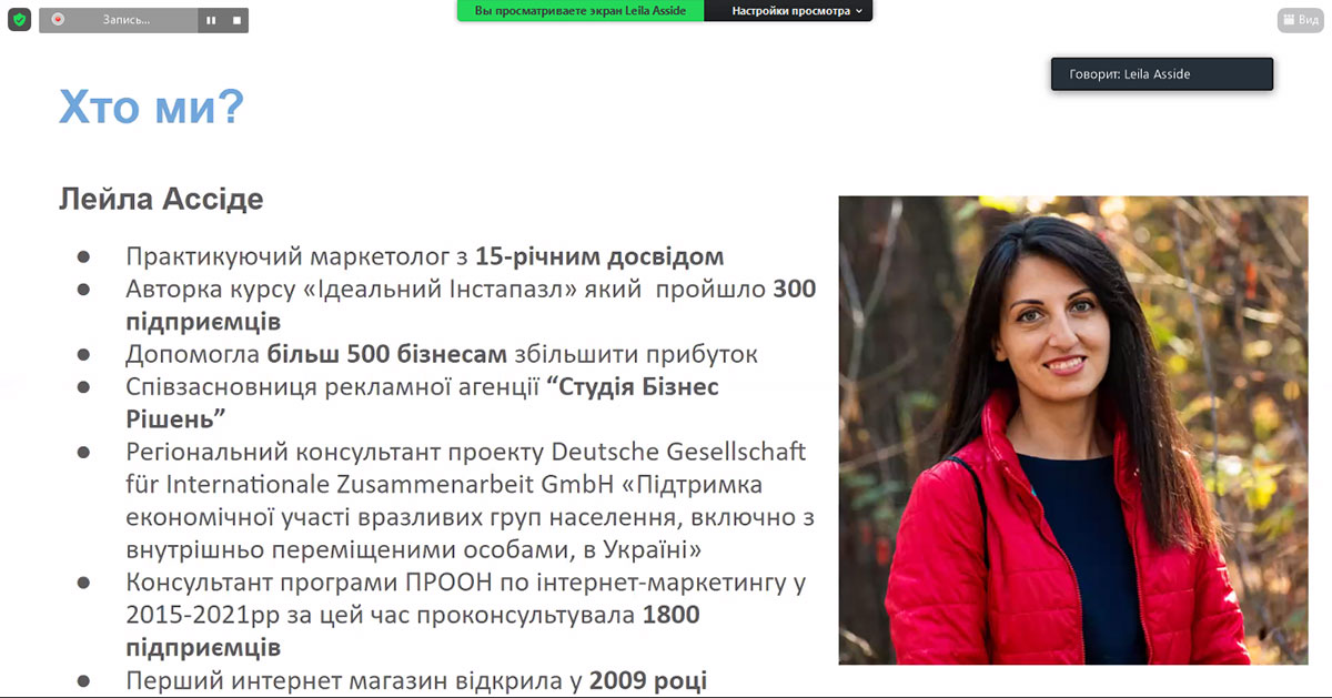 24 лютого 2023 року відбувся онлайн-тренінг з теми: «Взаємодія класичного маркетингу з диджитал маркетингом для просування офлайн-бізнесу». Спікери – Наталія Марченко, провідний спеціаліст з маркетингу «SYNLAB-UKRAINE» і Лейла Ассіде, провідний маркетолог та співзасновниця рекламної агенції «Студія Бізнес Рішень».