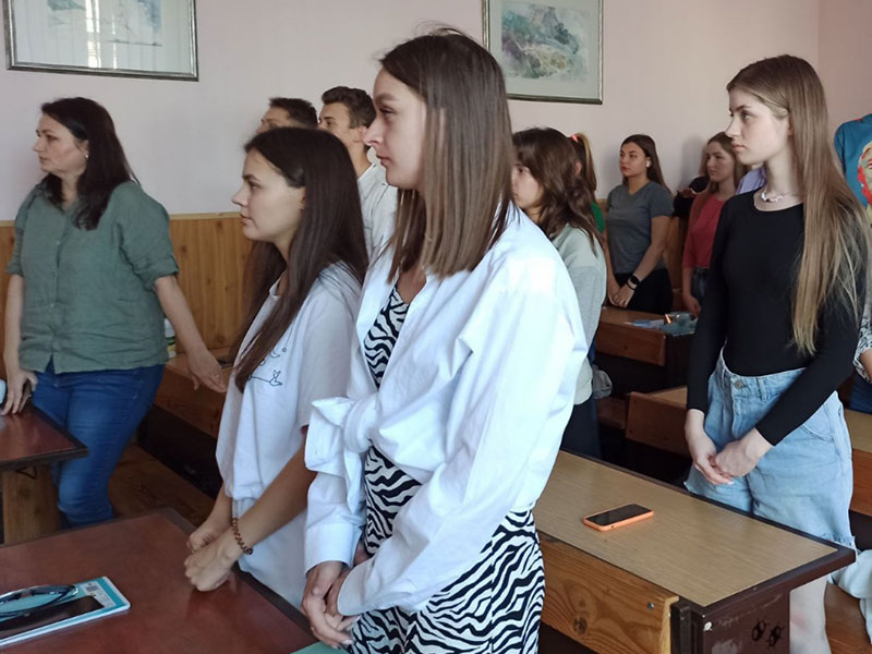 Продовжився захід виступами Анастасії Бережної, здобувачки вищої освіти ДонНАБА із доповіддю «Учителька із Краматорська – захисниця територіальної цілісності і незалежності України» та Данила Папуши, здобувача вищої освіти ДонНАБА, який виступив із доповіддю «Захисники України із Краматорська».