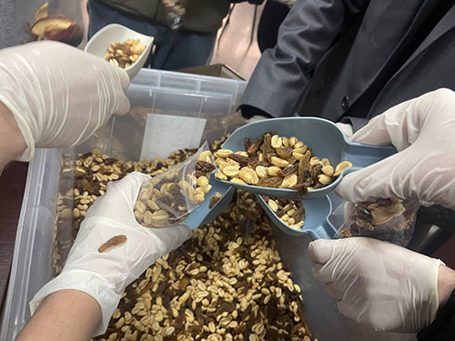 Наші партнери – волонтери із «Смаколики для ЗСУ» силами однієї родини роблять цю необхідну справу. Вони заготовляють горіхи та фрукти, закуповують упаковки для фасування. І далі стає украй потрібною велика студентська допомога, бо чистити, фасувати і складати десятки та сотні кілограмів сухпаїв – то велике завдання. Треба зазначити, що наші студенти з ним чудово справляються.