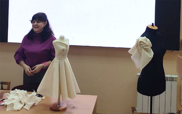 Під час лекції пані Марина, випускниця КНУТД, фахівець з макетування одягу, дизайнерка, кількість дописувачів якої з різних країн світу в інстраграм maryna_kisil_studio становить понад 126 тис., розповіла студентам про свій шлях професійного становлення та важливість процесу макетування в діяльності дизайнера, модельєра-конструктора одягу. Лекторка наочно показала прийоми роботи з матеріалом на манекені, докладно пояснюючи всі нюанси отримання форми та продемонструвала декілька варіантів драпірування ліфа, рукава та спідниці.