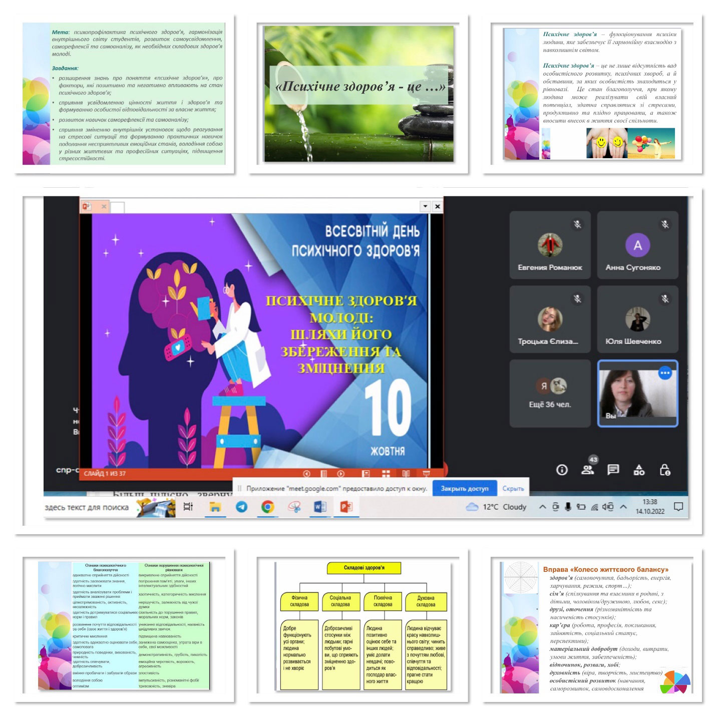 У заході взяли участь 43 учасники: студенти та аспіранти КНУТД. Особливу увагу під час онлайн-лекції було приділено значенню психічного здоров’я для здійснення життєдіяльності людини, розглянуто чинники, які позитивно та негативно впливають на стан психічного здоров’я, цінності життя і здоров’я у формуванні особистої відповідальності за власне життя. Під час лекції лектор ознайомила учасників заходу з методами профілактики психічного здоров’я та фізіологічними способами розрядки, що відновлюють людину. Римма Вікторівна розповіла як розвивати навички саморефлексії та самоаналізу, як змінювати внутрішні установки щодо реагування на стресові ситуації, як сформувати практичні навички подолання несприятливих емоційних станів, як володіти собою у різних життєвих, професійних ситуаціях та підвищити стресостійкість. Здобувачі вищої освіти виконали вправу «Колесо життєвого балансу» – ефективний і універсальний інструмент, за допомогою якого можна визначити проблемні сфери свого життя, стабілізувати їх і у такий спосіб стимулювати особистий розвиток. Студенти й аспіранти мали змогу визначити рівні стресу, морального стану та виснаження за допомогою тесту, який призначений для моніторингу психологічного стану, щоб відстежувати свій стан та вчасно врегульовувати його. У лекції було продемонстровано способи зменшення тривоги, надано практичні рекомендації щодо першої допомоги у стресових ситуаціях, як зберегти та покращити психічне здоров’я, як сформувати звичку бути щасливим та вправи, що допоможуть виробити «гормони щастя».