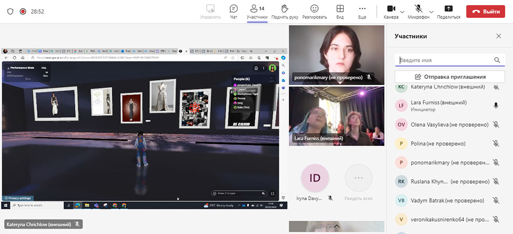 Мета зустрічі – презентація результатів проєкту на віртуальній виставці, організованій здобувачами освіти кафедр мультимедійного дизайну, мистецтва та дизайну костюма КНУТД, а саме: Дариною Козачище, Марією Пономаренко, Кірою Сизько, Поліною Квятковською, Юлією Георгієвою, Анатасією Янчук, Надією Грошенко та студентами факультету мистецтв, моди і медіа Бірмінгемського міського університету (Велика Британія). Куратори проєкту – викладачі Бірмінгемського міського університету Лара Ферніс (Lara Furniss), Катерина Крічлоу (Kateryna Chrichlow) та КНУТД Калина Пашкевич, декан факультету дизайну, Олена Васильєва, завідувачка кафедри мультимедійного дизайну. На демонстрацію віртуальної виставки були запрошені викладачі та студенти кафедр факультетів партнерських університетів.