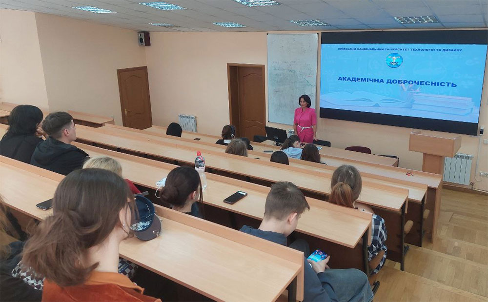У рамках підтримки цих ініціатив у КНУТД вже стало доброю традицією на початку навчального року проводити тематичні лекції для студентів-першокурсників. 11 вересня 2025 року для них виступила Олена Степанова, професор, доктор культурології, керівник Центру менеджменту якості освітньої діяльності університету. Вона прочитала лекцію «Академічна доброчесність» для студентів спеціальностей A5 Професійна освіта (Технологія виробів легкої промисловості), С4 Психологія та G15 Технології легкої промисловості.