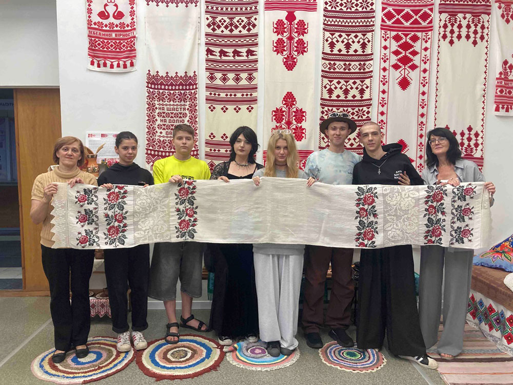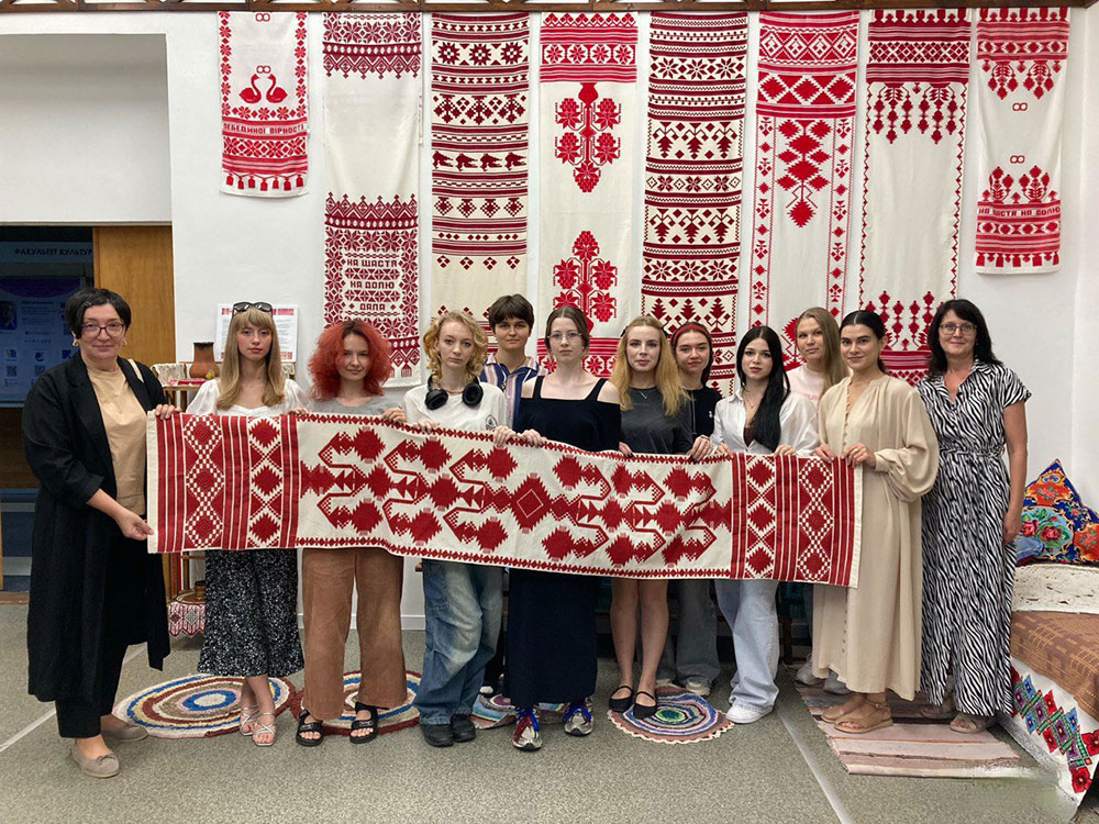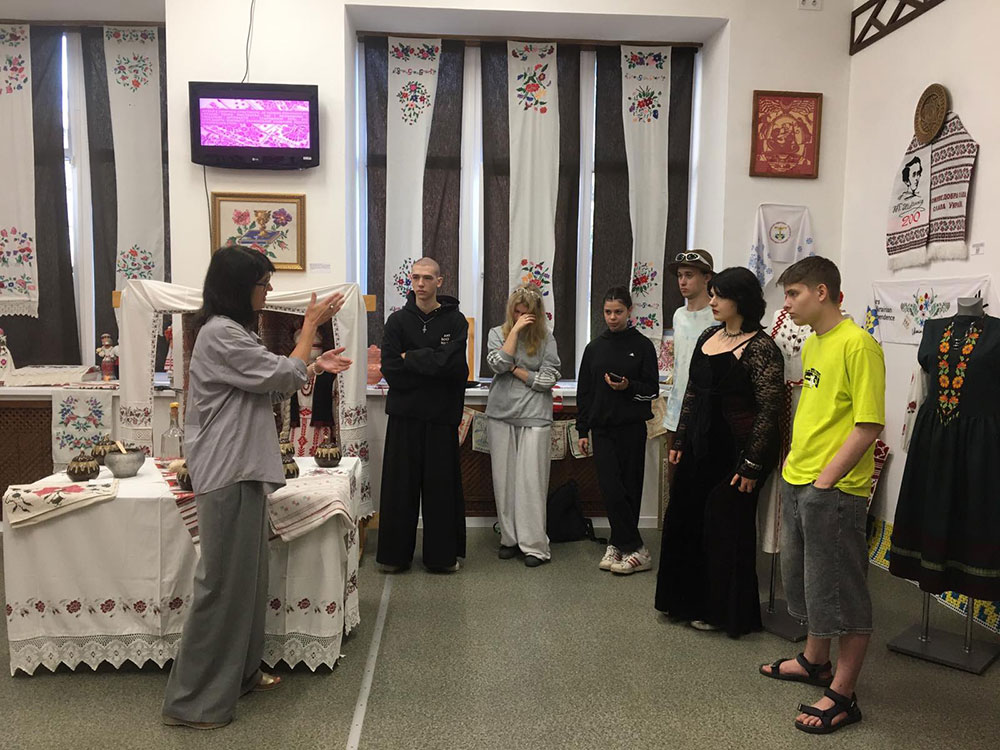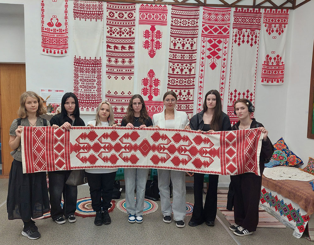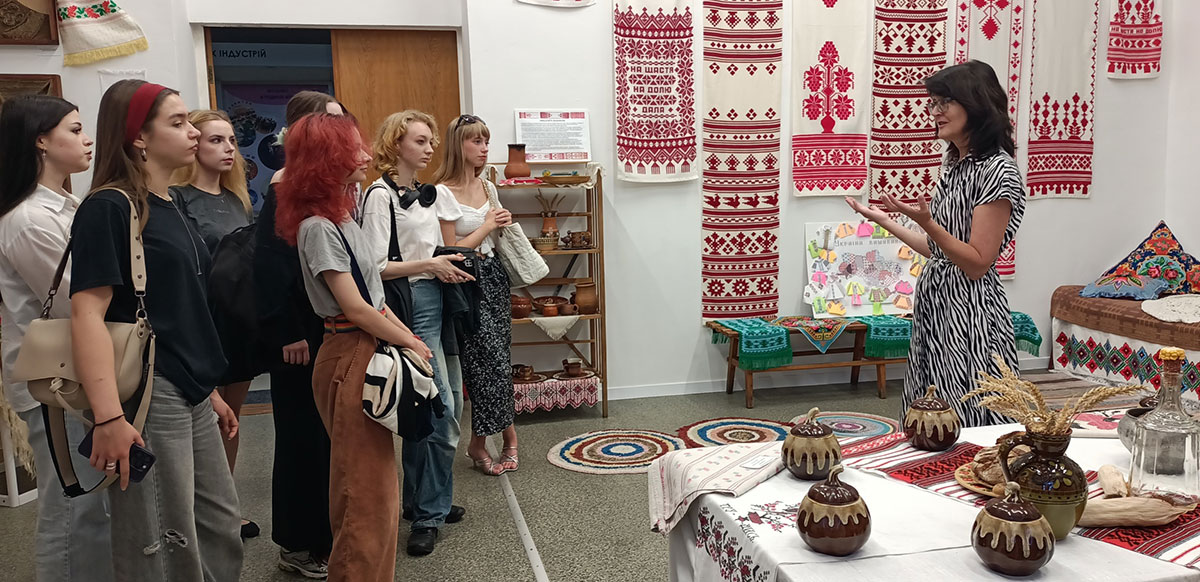 Приємно вразив своєю експозицією Музей вишивки (ауд. 1-0115). Студенів привітно зустріла Людмила Крехова, завідувачка відділу зберігання фондів, яка цікаво, професійно та натхненно розповіла про українські звичаї, обряди та свята, особливості української вишивки, підкреслила унікальність техніки виконання кролевецьких рушників та традиції пов’язані зокрема з Музеєм вишивки. Кожна ділянка та експонати музею стали для студентів справжнім відкриттям, адже кожен експонат втілює багатогранність та індивідуальність спадщини культурних традицій українського народу. Пані Людмила цікаво і зворушливо розповіла про українські традиційні обряди, такі як весілля, хрестини та поминальні обряди, а також про побутові обереги, про значення орнаментів – символів на вишитих рушниках. Присутні також ознайомилися з історичною спадщиною українського народу та предметами декоративно-прикладного мистецтва, що в подальшому може стати творчими ідеями або джерелом натхнення для створення власних авторських колекцій та творчих проєктів.