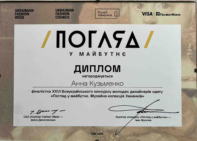 Третє місце у конкурсі «Погляд у майбутнє. Музейна колекція Ханенків» посіла випускниця кафедри мистецтва та дизайну костюма Анна Кузьменко – молода талановита дизайнерка бренду одягу LeCri. Цього року Анна долучилася до викладання в КНУТД і передає свої професійні знання та досвід здобувачам ОП «Дизайн одягу» в межах навчальних дисциплін.