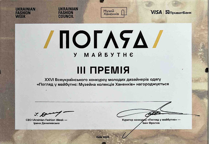 4 вересня 2025 року в межах Ukrainian Fashion Week SS 2026 відбувся фінал XXVI Всеукраїнського конкурсу молодих дизайнерів одягу «Погляд у майбутнє». Експертне журі конкурсу – відомі українські дизайнери й члени Ukrainian Fashion Council: Іван Фролов, Світлана Бевза, Ірина Каравай, Лілія Літковська, Лілія Пустовіт, Ксенія Шнайдер оцінили творчі колекції 10 фіналістів конкурсу – роботи, натхненням для яких стала спадщина видатних українських колекціонерів та меценатів Богдана та Варвари Ханенків.