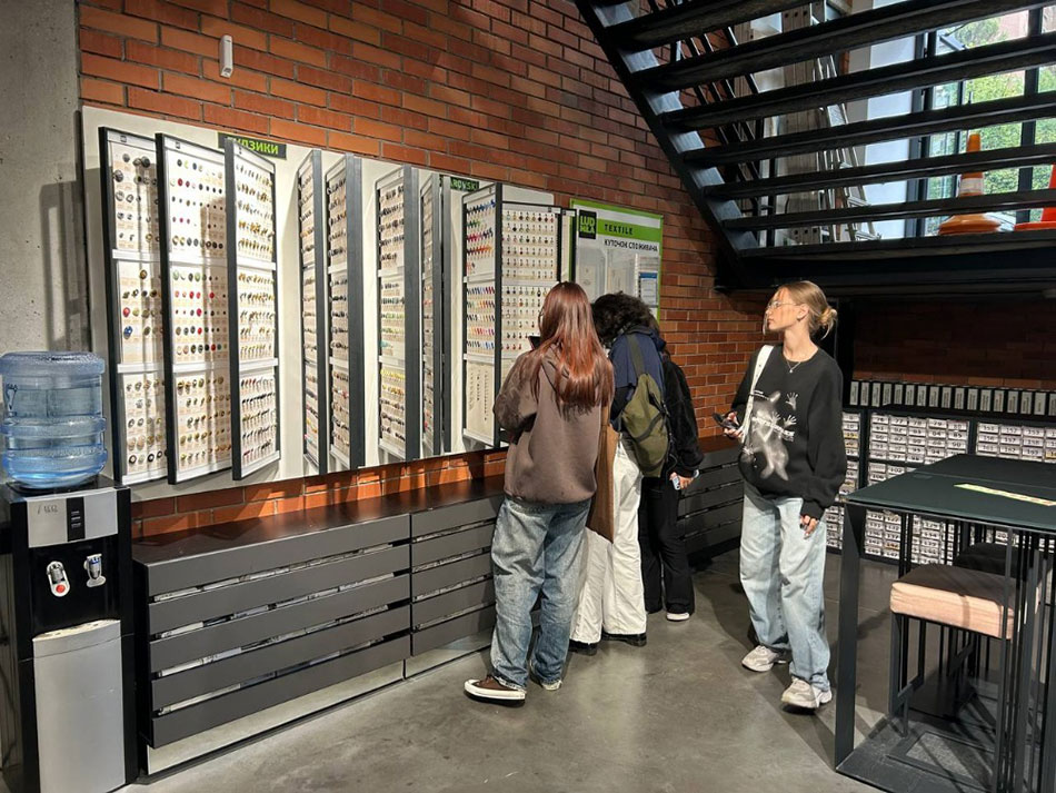 Окремим етапом зустрічі стало ознайомлення з матеріалами та тканинами, які використовують для пошиття. Значне зацікавлення викликала можливість побачити виробничий процес: роботу швей і майстрів, які займаються виготовленням деталей і фурнітури, зокрема авторських ґудзиків.
