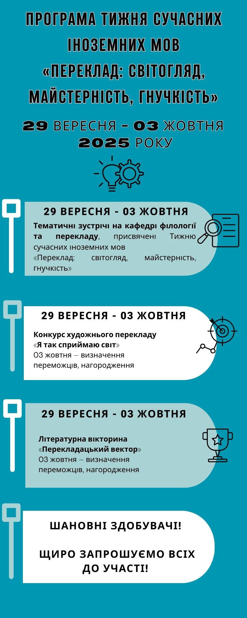 29 вересня – 03 жовтня 2025 року кафедра філології та перекладу факультету культури і креативних індустрій сердечно запрошує вас узяти участь у заходах Тижня сучасних іноземних мов «Переклад: світогляд, майстерність, гнучкість»!
