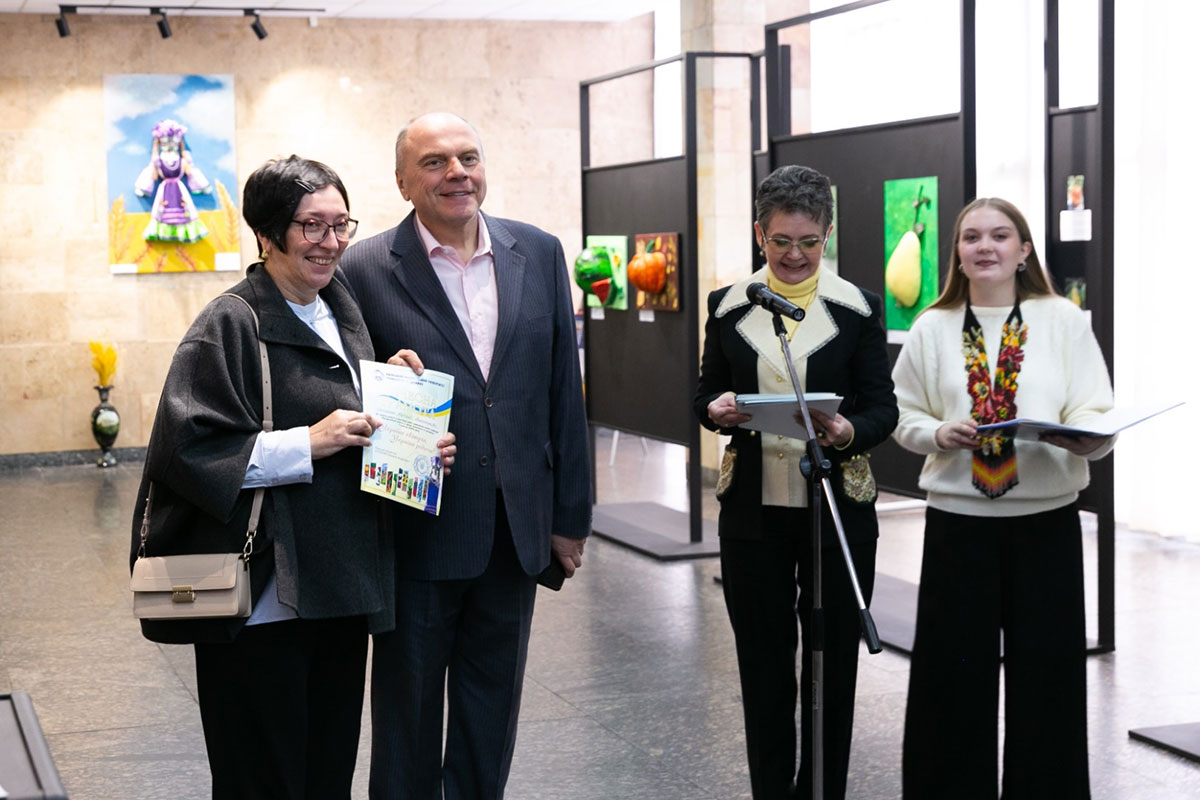Наталія Остапенко, декан факультету мистецтв і моди, доктор технічних наук, професор подякувала Олександрі Володимирівні за підтримку молодих талантів, за розуміння важливості розвитку здібностей і креативності молоді. Вона відзначила, що горельєфні зображення великої кількості яскравих квітів, фруктів, овочей тощо нагадує, що життя швидкоплинне і найцінніше у ньому – це час, який не зупиняється. Виставка є гучним ідейним посилом і відповідає викликам сьогодення «Ми різні, але об’єднані любов’ю до рідної землі». Коли кожен день є випробуванням для національного духу, виставка є проявом творчого єднання студентів і викладачів, їхня рефлексія на події сьогодення, пошук нових значень, утвердження віри у нашу Перемогу. Наприкінці пані Наталія побажала молодим творцям краси і гармонії, наснаги, миру та добробуту.