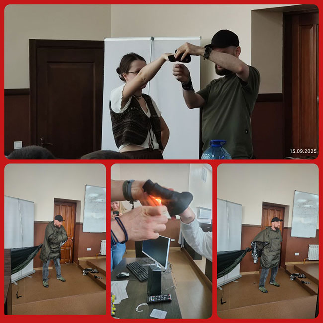 Під час зустрічі студенти мали можливість побачити різновиди моделей виробів, що трансформуються та комбінуються, дізнатися про інноваційні рішення їх конструкції та виготовлення. Особливу увагу Дмитро приділив важливості вибору якісних матеріалів для виготовлення конкурентоспроможних виробів. Студентам було представлено сучасні спеціалізовані синтетичні тканини з водовідштовхувальними та зносостійкими характеристиками, що активно використовує компанія у власному виробництві; фурнітуру провідних світових виробників (YKK, Woojin), виготовлену відповідно до міжнародних стандартів; вогнестійкий утеплювач, який забезпечує захист у разі впливу високих температур і підвищує експлуатаційні характеристики виробів; балістичні пакети типу AP, що використовуються для забезпечення захисту користувача в екстремальних умовах. Демонстрація зразків продукції дала змогу здобувачам вищої освіти ознайомитися з особливостями конструктивних рішень і трансформаційних можливостей спорядження.