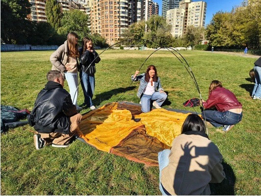 Практичну складову було представлено на майстер-класі з активного туризму під керівництвом Леоніли Ткачук, доц. кафедри ТГРБ. Учасники мали змогу відпрацювати навички встановлення наметів, організації побуту під час походів і тренували командний дух!