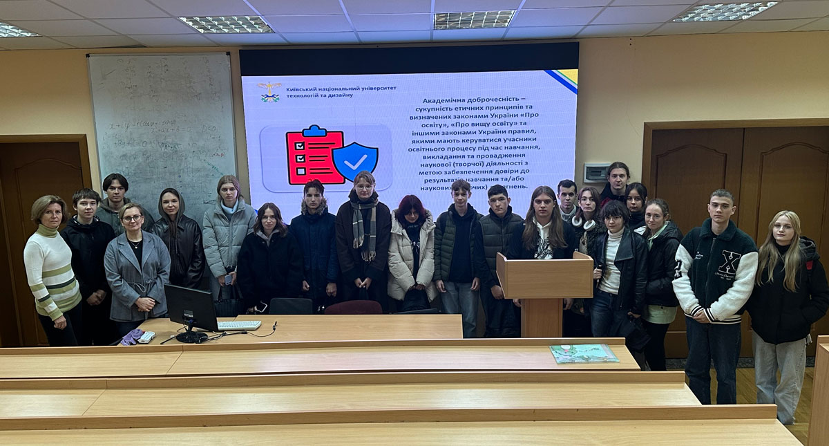 08 жовтня 2025 року здобувачі освіти факультету хімічних та біофармацевтичних технологій Київського університету технологій та дизайну спеціальностей G1 Хімічні технології та інженерія (освітні програми Хімічні технології та інженерія, Інноваційна фармацевтика) та G21 Біотехнології та біоінженерія (освітня програма Біотехнологія), взяли участь у важливій освітній події — лекції на тему «Правові та етичні засади академічної доброчесності», організованої Центром моніторингу якості освітньої діяльності спільно з деканатами факультетів університету, з метою поглиблення розуміння важливості дотримання високих стандартів чесності та етики в навчальній та науковій діяльності.