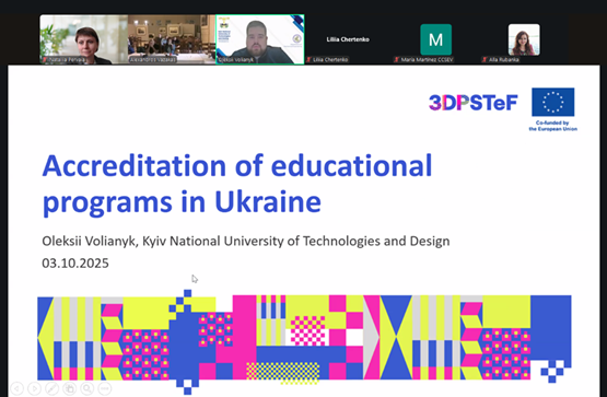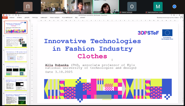 2–3 жовтня 2025 року науково-педагогічні працівники Київського національного університету технологій та дизайну взяли активну участь у стартовій зустрічі міжнародного проєкту 3DP-STeF «Технології 3D-друку для текстилю та тканин на засадах сталого розвитку /3D Printing for Sustainable Textile and Fashion Education», яка відбулася в онлайн-форматі в Технічному університеті Кріту (м. Ханья, Греція).