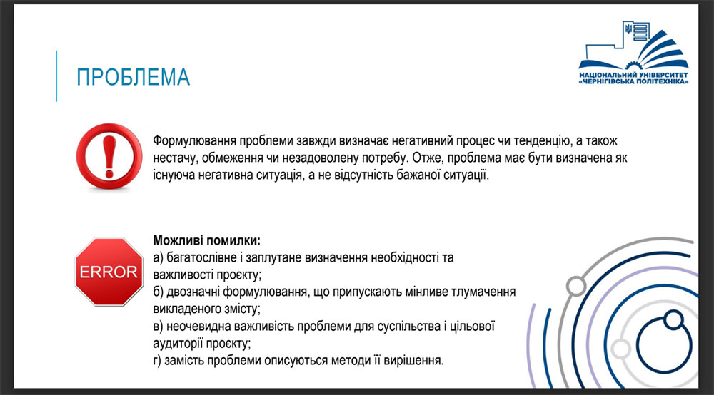 У рамках воркшопу було розглянуто ключові етапи створення ефективної грантової заявки: від чіткого формулювання проблеми й визначення цільової аудиторії до побудови календарного плану, розрахунку бюджету та розробки системи моніторингу результатів.