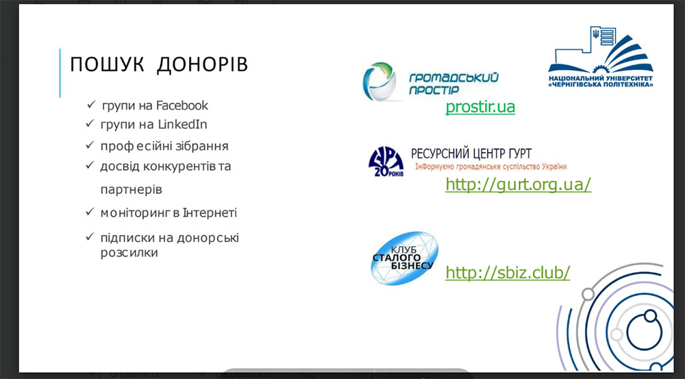 У своєму виступі Наталія Холявко звернула увагу на поширені помилки в процесі підготовки грантових заявок і надала дієві рекомендації щодо ефективного пошуку міжнародних донорських програм як в ЄС, так і поза його межами.