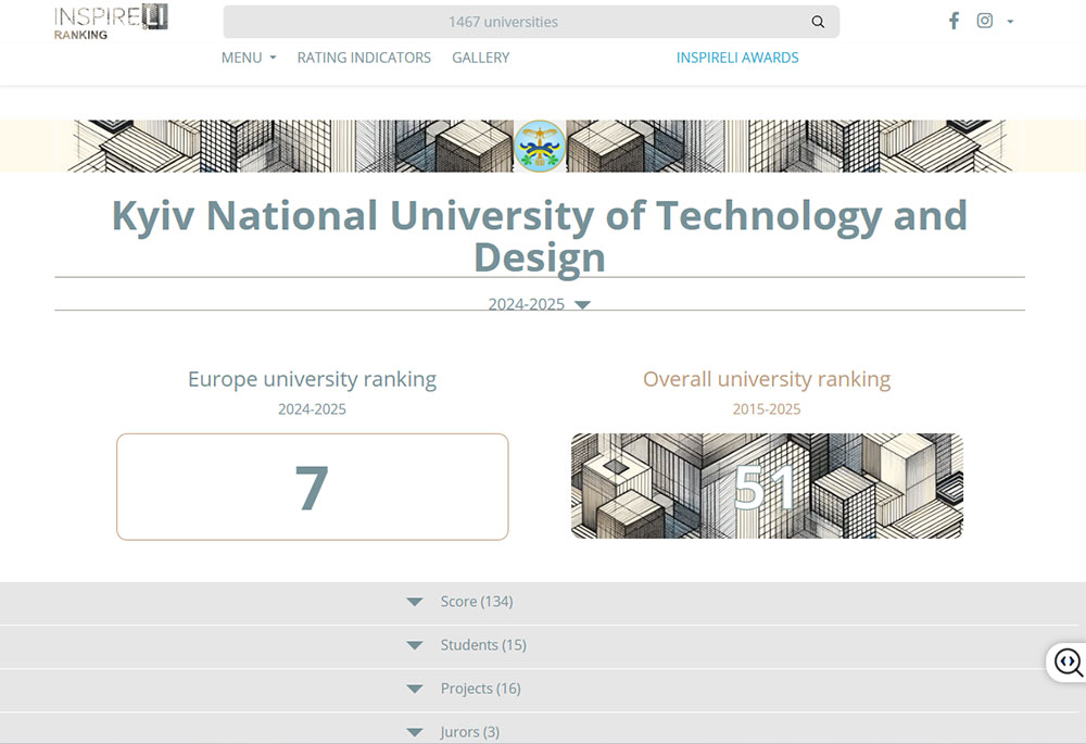Завдяки цьому успіху, а також постійній участі у конкурсі студентів освітніх програм «Дизайн середовища» рівнів бакалавр та магістр, КНУТД увійшов до рейтингу кращих університетів світу за результатами INSPIRELI AWARDS, посівши 7 місце серед університетів Європи та 51 місце серед 1467 закладів архітектурно-дизайнерської освіти з усього світу, що брали участь у конкурсі.