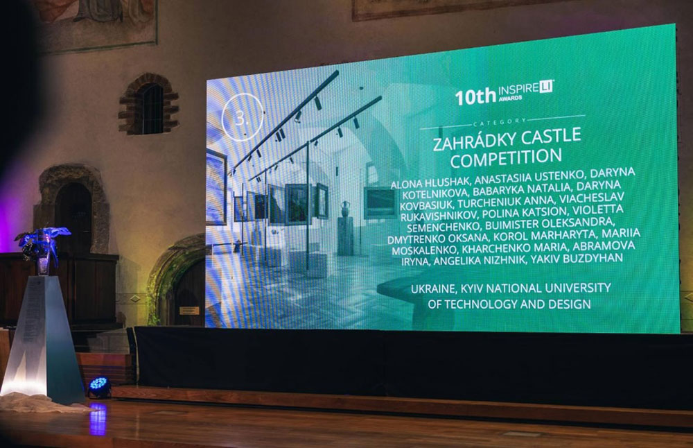 6 жовтня 2025 року в Празі, у вражаючому інтер’єрі Віфлеємської каплиці, відбулася урочиста церемонія нагородження переможців Міжнародного архітектурно-дизайнерського конкурсу «INSPIRELI AWARDS». Група магістрантів освітньої програми «Дизайн середовища» КНУТД під керівництвом Тетяни Булгакової, доцента кафедри дизайну інтер’єру і меблів, кандидата технічних наук, доцента, здобула третє місце у конкурсі «Zahrádky Castle Competition».